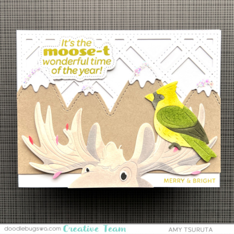 I’m back with another project for Doodlebugs… My card for today features: If you’ve been following me for a bit, you know that I love puns. The sentiments are stamped in Concord & 9th – Lemongrass. The Cardinal was stenciled with: The moose has been stenciled with the following: The lights have been stenciled with: Do