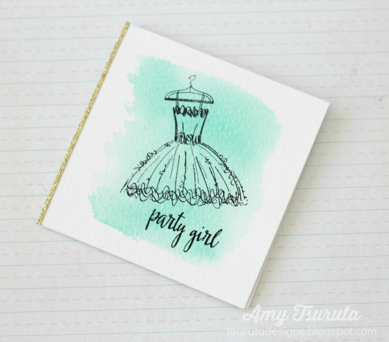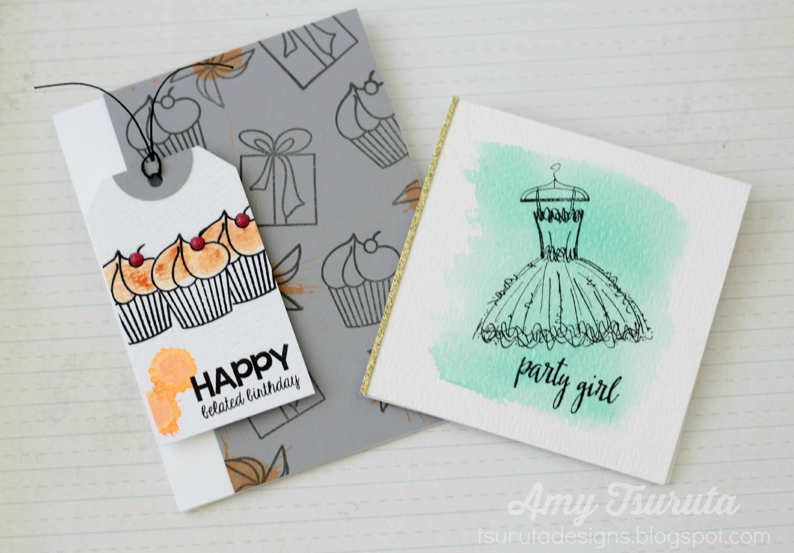 Awesome cards, Amy! Love both of them to pieces! The watercolor wash and splats are such a fun touch on both. Love the elegant feel of the party dress card with the strip of gold glitter paper on the side, and love the tag on the birthday card. Congrats on your guest designer spot!