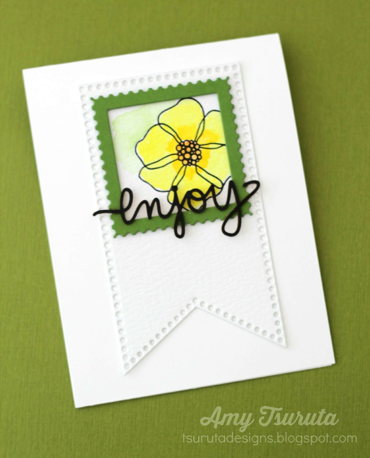 cardstock: recollections/110/white, ranger watercolor, stampin’ up gumball green stamps: create a smile/magic flowers ink: ranger archival black, kuretake gansai tambi other: create a smile stacked pierced banners/magic frame cool cuts, create a smile enjoy chippie