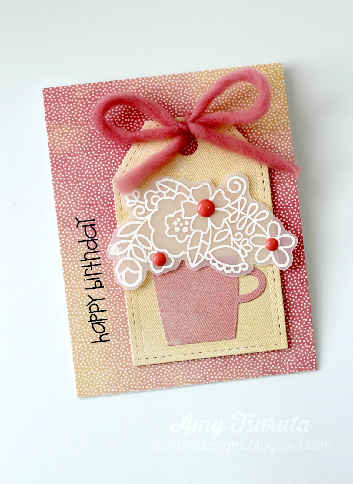 OMGosh, how cute! I love those bitty polka dots and LOVE the vase of flowers! How fun to use vellum for the flowers and that coffee cup for the vase! Loving your tag with chunky yarn, too!