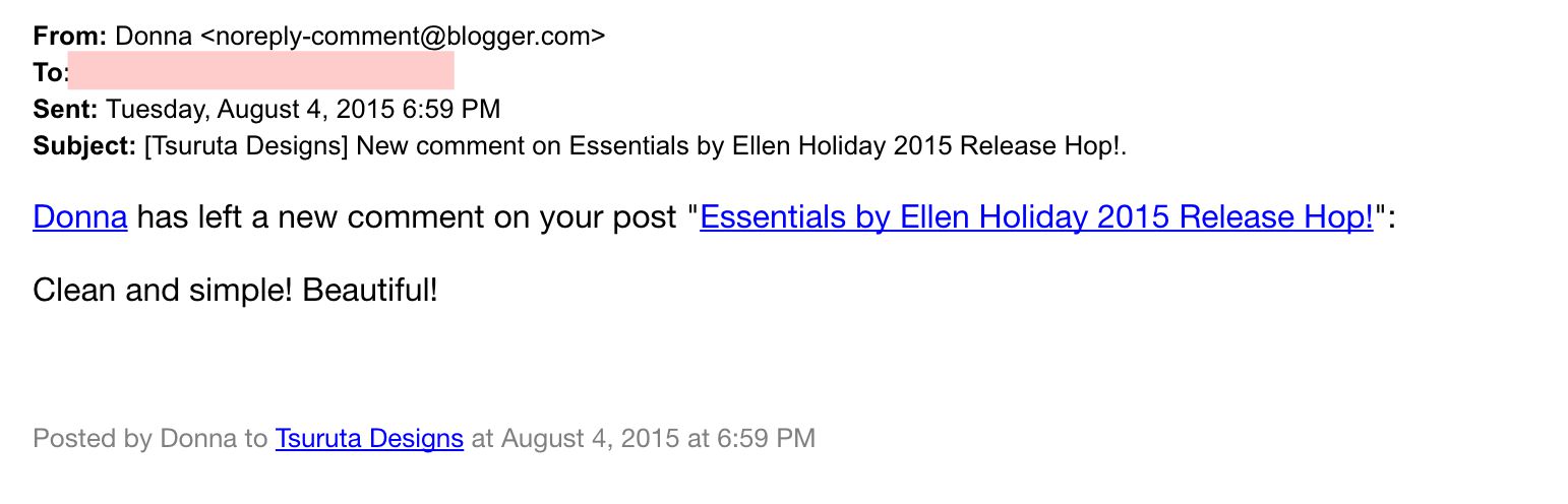 Okay, so big deal? Well, I’m guessing that Donna is perhaps leaving me a comment because she wants to be in the drawing for the gorgeous Essentials by Ellen Mistletoe & Holly set. When I actually clicked on Donna’s name {blue hyperlinked one}, it took me to her blogger profile and guess what? She doesn’t have a blog or any contact information. It would make me super sad if her name was drawn using random.org because there is no way for me to contact her.