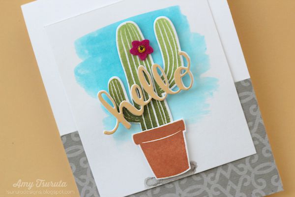 I totally recognized the Tazo Tea box, but couldn't remember from what 😀 Love the 3-D ombre cactus and hello dies on your adorable card, Amy!