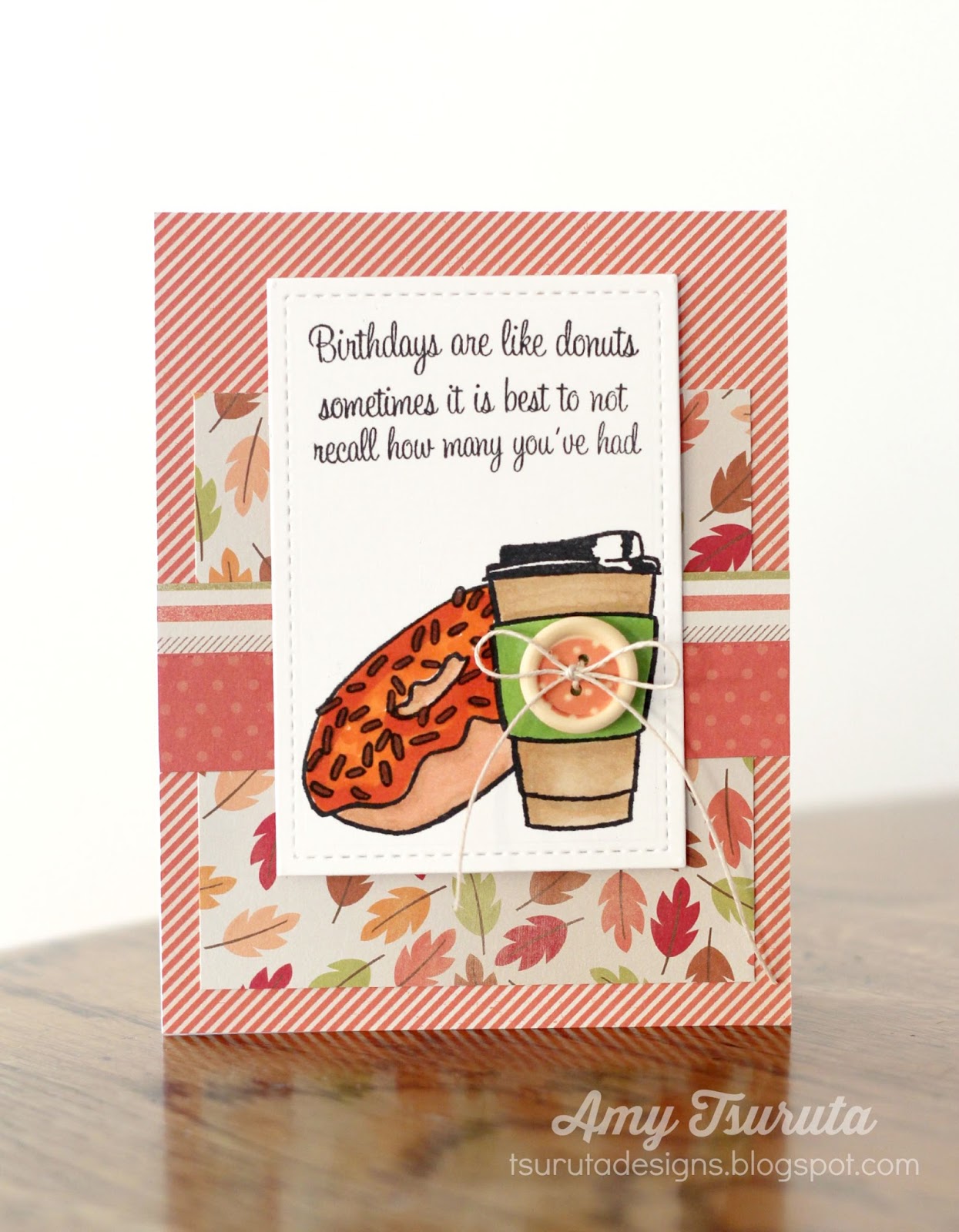 cardstock: recollections/110/white paper: imaginisce give thanks stamps: skipping stones design funny coffee vol. #1/birthday donuts ink: memento tuxedo, various copics other: imaginisce button, may arts twine