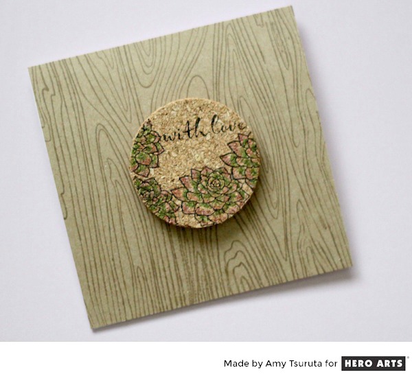 Here’s my second project, you may have seen this earlier on the Hero Arts blog. I love all things texture-y so I couldn’t wait to stamp the succulents onto a cork circle. I love how you can really see the colors from the alcohol markers.