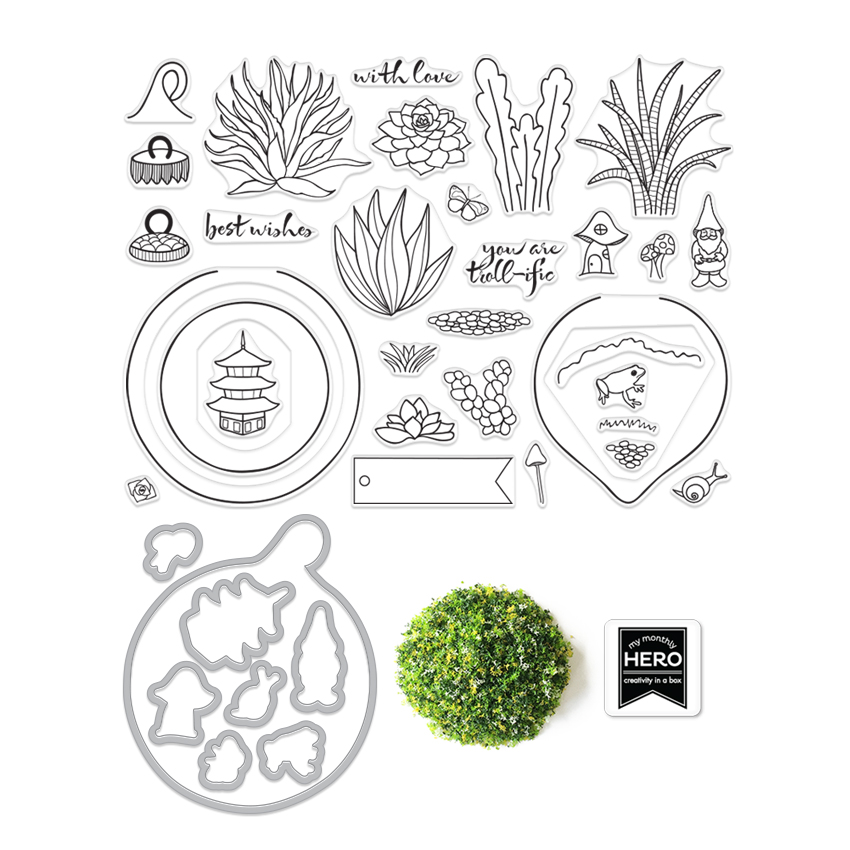 I know, it’s DARLING isn’t it?! It’s a large 6×8 stamp set! I’m a huge fan of terrariums, succulents, mushies and gnomies♡ Here’s my first project…I layered everything onto a 3.25 inch circle….the gnome/troll and mushroom have been cut out but the gnome/troll is on foam adhesive.