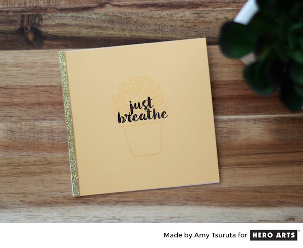 I’m a big fan of the tone-on-tone look…the Potted Succulent was inked up with Butter Bar Shadow ink and I stamped the sentiment, from the Hello Gorgeous clear set. I couldn’t resist putting a thin strip of gold glitter on my card.