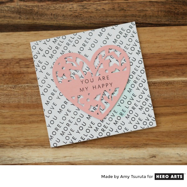 I stamped the background by using a sentiment from the new You are my Happy set that is in the 2016 Valentine’s Collection. I used the Floral Heart stamp & cut and stamped another sentiment from the You are my Happy set. Do you see the smidge of green, I wanted to add a bit of zing to the background with Cracked Pistachio Distress ink.