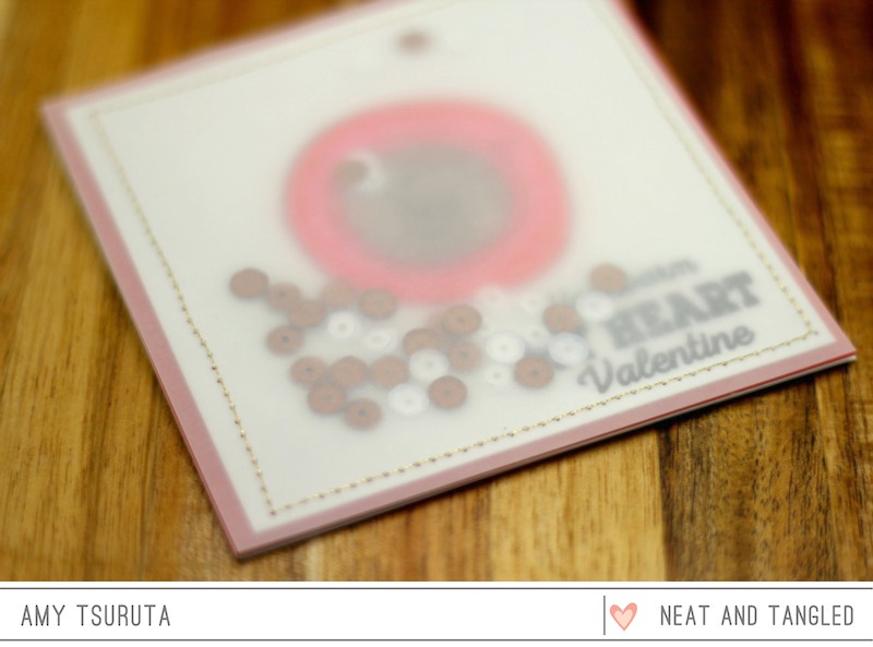 Oh yes, I love this set by the talented May Park! I’ve been in shaker mode and this is one of the easiest ways to create one…just add sequins and stitch a vellum panel over it. Can you spy the gold thread? I used Copper Penny + Snow White sequins.