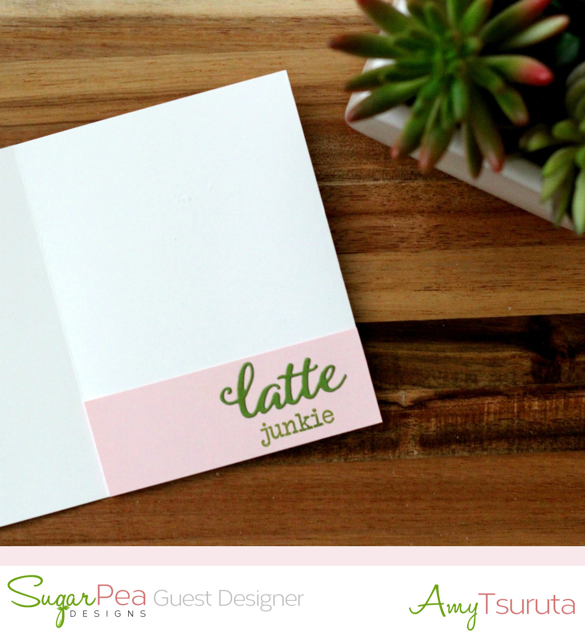 latte junkie…(chuckling) Love the SugarCuts – Coffee Words. Makes it fun to team up with other words and sentiments…I used the Caffeine Addict stamp set’s Junkie.
