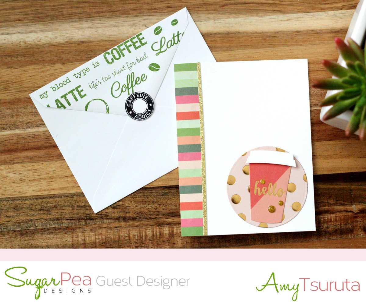 I used the SugarCuts – Coffee To Go Cup on the front of my card. I strategically placed it on top of a great mini journal card. Did you see my envelope? I used my MISTI and loaded it up with words from Caffeine Addict and the Espresso Yourself stamp sets.