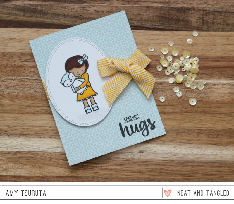 Oh, those kids in the set are super sweet, aren’t they?! I adore the sentiments too! I stamped and copic colored the little girl and owl on an oval panel. I stamped the sending hugs set and finished it off with a bow. Super easy but love the blue and yellow combo, how about you?