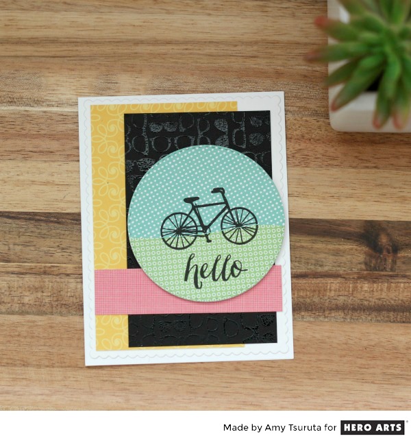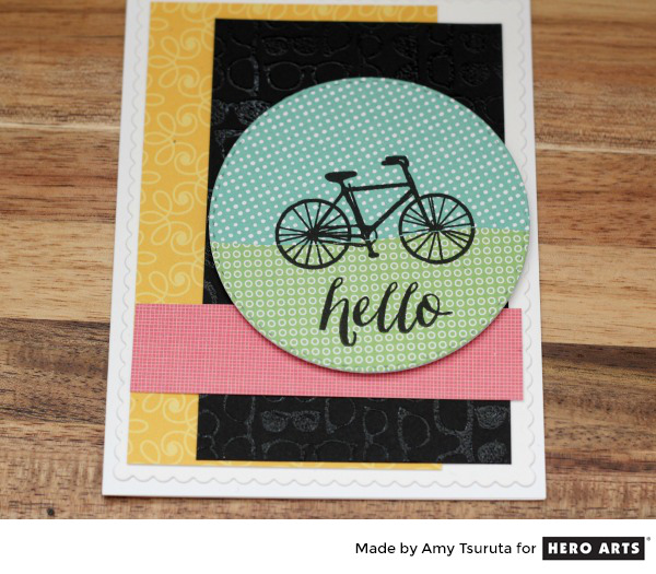 Do you see the clear embossing on the black panel? It is the new Glasses Bold Prints. It’s a super fun 6×6 background stamp…love it! The bicycle is from the new Hipster at Heart set.