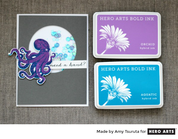 I used the sequin mix from the July MMH kit and the Optional Add on Color Layering Octopus stamp set. I love how it turned out with the Orchid + Aquatic Bold Inks!