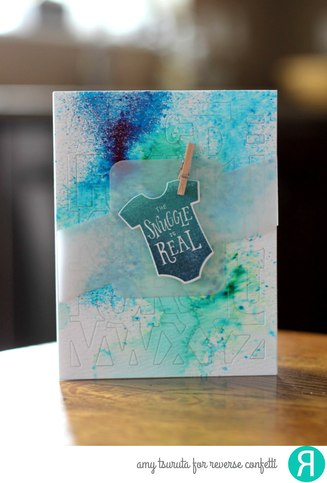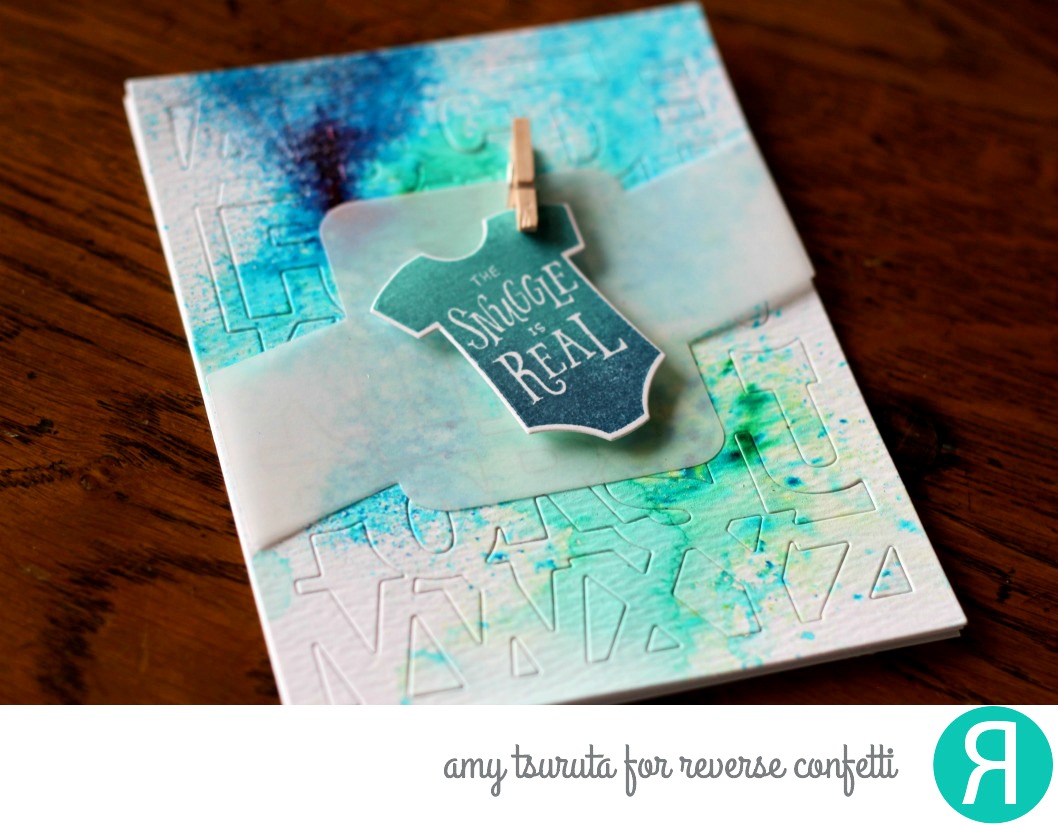 The Snuggle is Real…don’t you just love that?! I inked up the onesie with Hero Arts Ombre Pool to Navy. Do you see the vellum panel? I used the Rounded Rectangle Band Confetti cut. It’s a great way to anchor images!