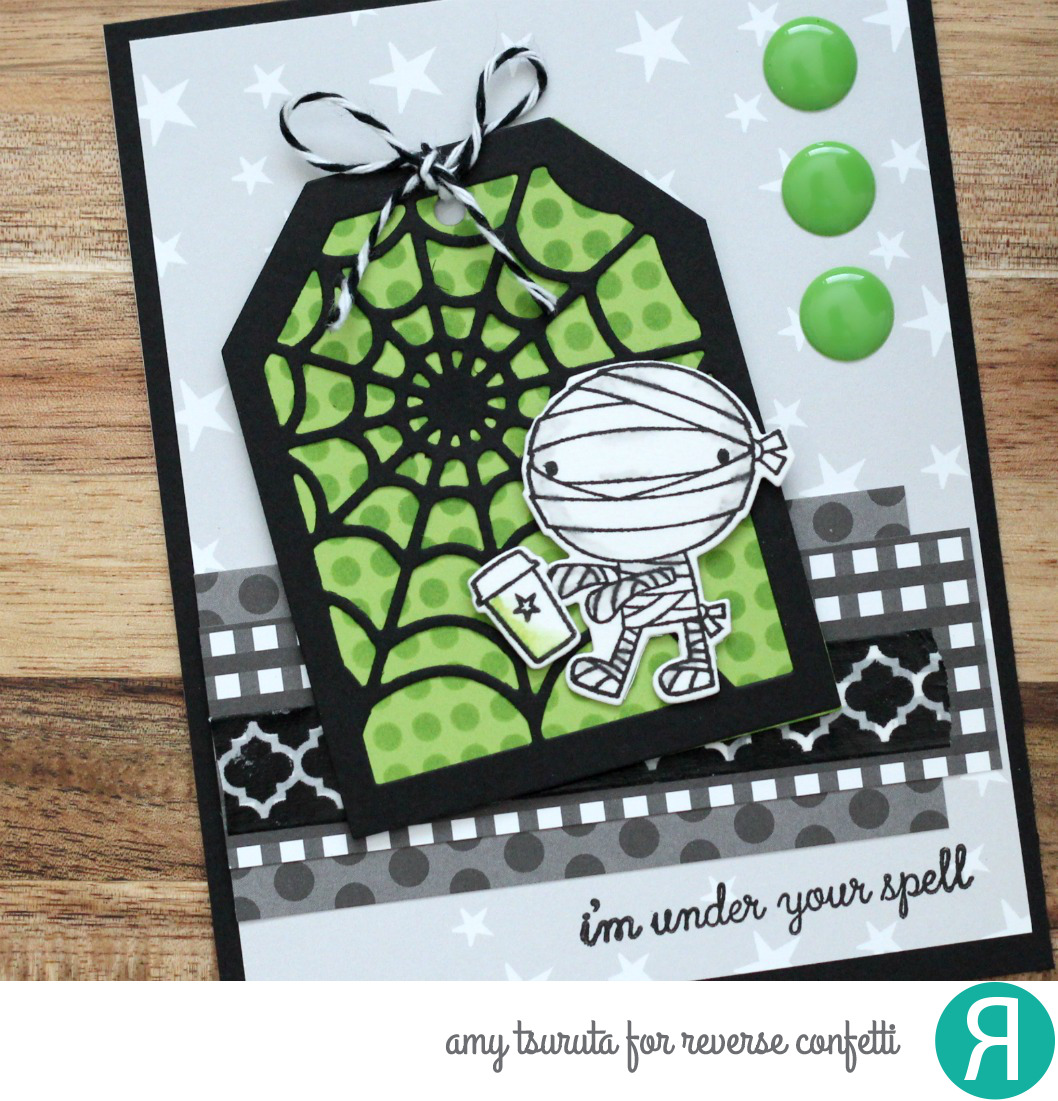 Great cards! Love the mummy and the green in the background. Great spiderweb tag!