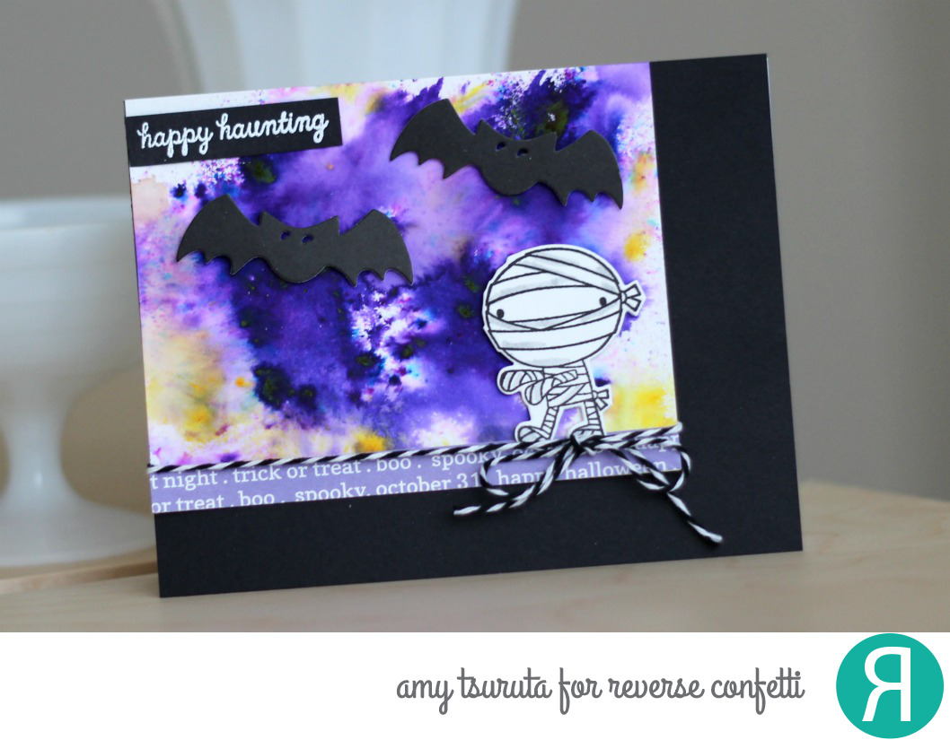 In case you were wondering, my background was made with Ken Oliver Color Bursts in Violet + Lemon Yellow. Perfect spooky background for that sweet Mummy.