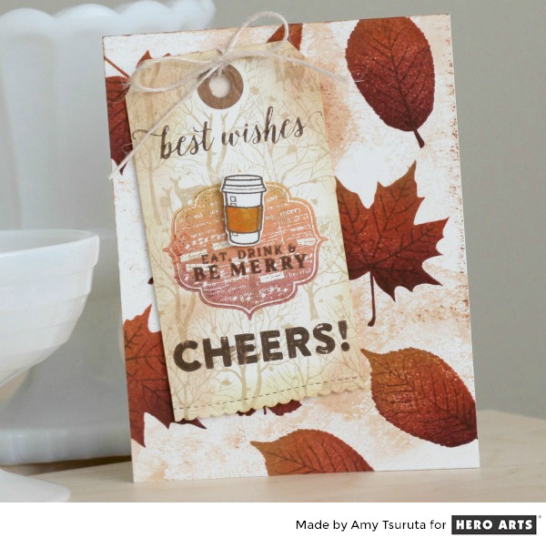 The tag has the Forest and Deer Bold Prints stamped in Soft Brown Shadow ink. The Holiday Messages and Tags has then been layered with the Ombre Autumn. The coffee cup from City Adventures has been stamped in Cup ‘O Joe and the sleeve has been colored with coordinating copics. The sentiments, including Cheers Messages by Lia, are stamped in Cup ‘O Joe ink. I distressed the edges, finished off the bottom with a Pretty Pink Posh Scallop Border and topped the tag off with May Arts twine.