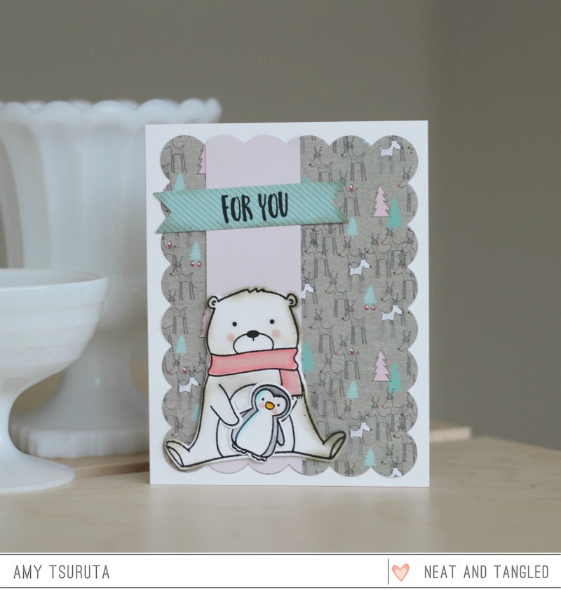 Great card! Love the scalloped cut patterned background and the adorable bear with penguin friend! Fun, fun, fun.