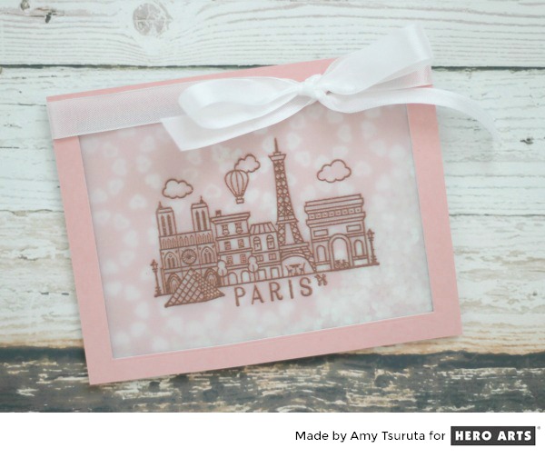 Amy, I love your Paris card and especially with your future entwined with it! The colors are so soft and the vellum also softens the card. The copper embossing powder is also soft. The bow tops it off. Have fun in gay old Paree!