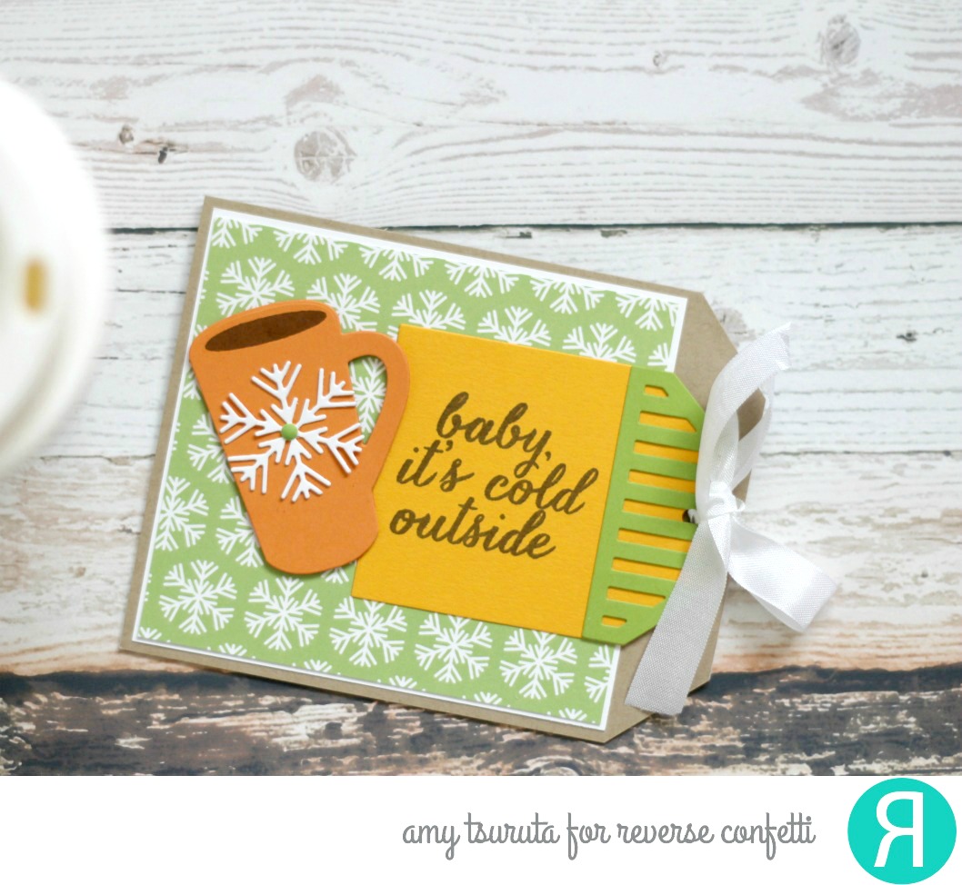 I can’t seem to get enough of coffee cards….I combined the Reverse Confetti Just Brew It stamps + coordinating confetti cuts with Seasonal Sentiments (a must have!). The mug has been cut with Tangerine and the Snowflake from Snowflake Trio is in Cloud White.