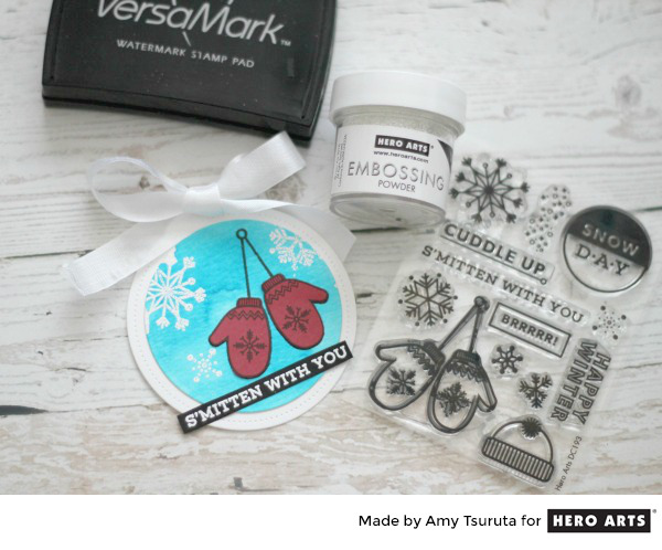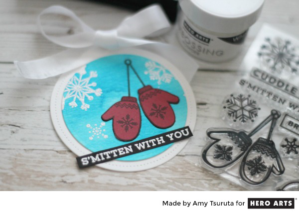 I had so much fun designing this tag! I used the Hero Arts Kelly’s S’mitten Stamp & Cut set. The mittens have been paper pieced with Blush Mixed Layering Paper. The snowflakes have been heat embossed with White Embossing Powder.