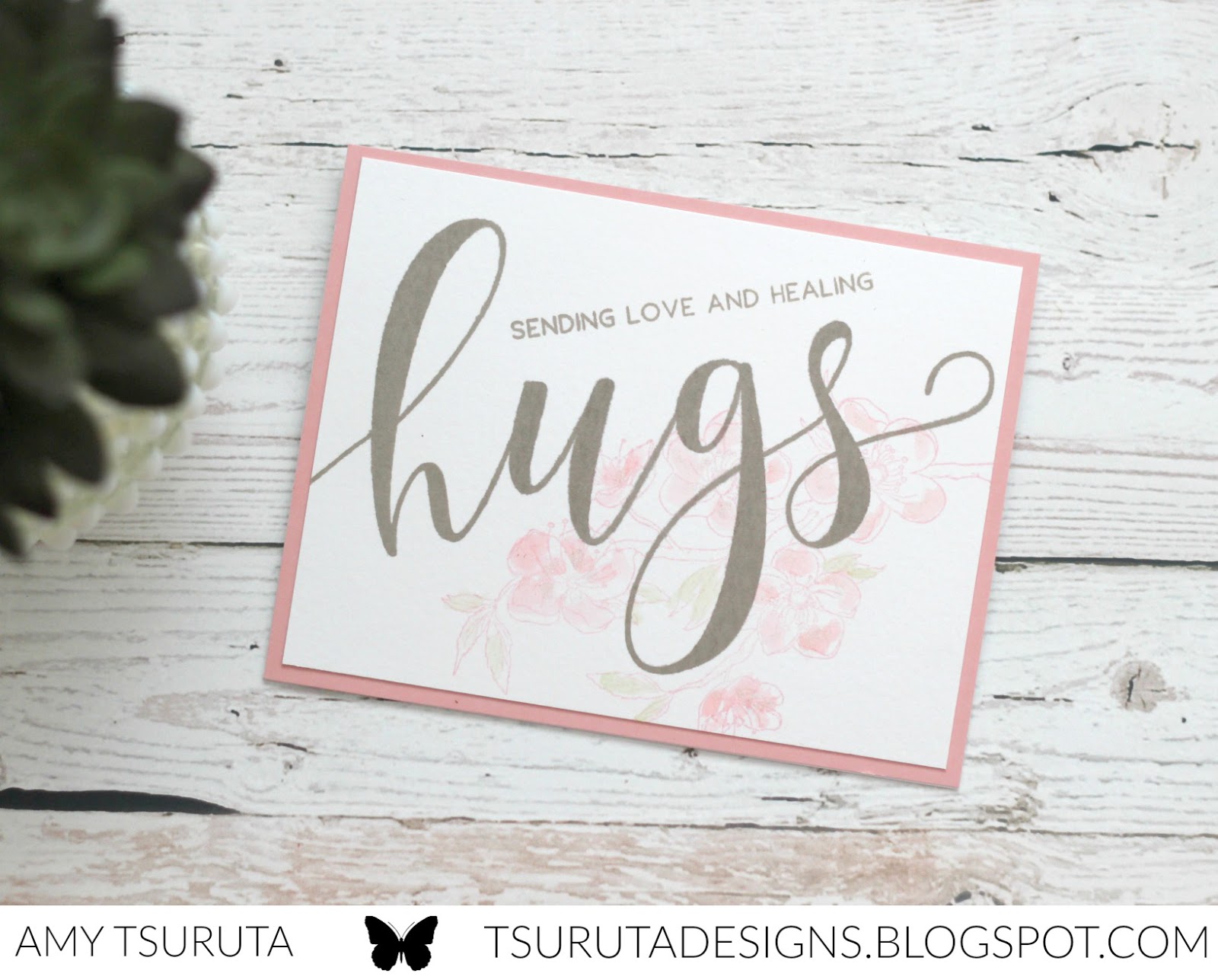 I stamped the Cherry Blossoms with Spun Sugar Distress ink and then layered the Hugs sentiment in a grey ink.