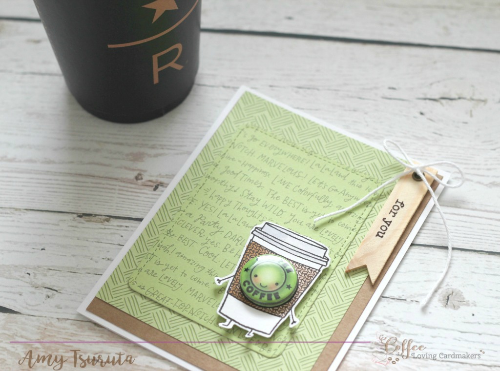 *Green!!* Those dps are the perfect shade, and that little Tin Pin matches so well. And that cup… It's cute enough without his TP face, but you've given him the sweetest face! I love this card!!! Gotta run though, I need more coffee!!! GREAT card!! Bev