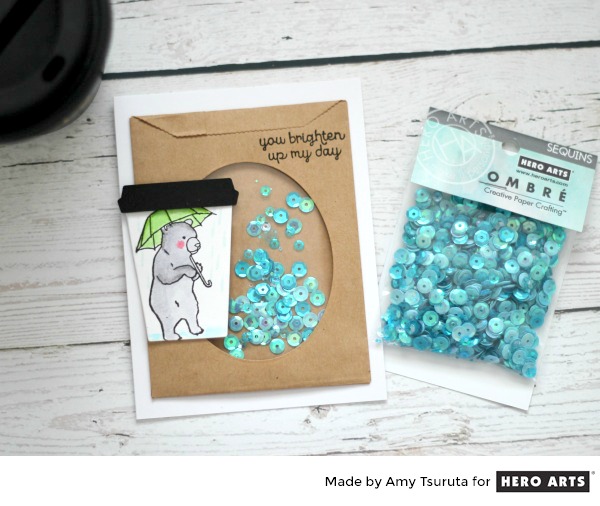 That bear and cup are so sweet, Amy!! I can see the subtle rain he's sloshing through, too. What a fun shaker card; everyone love them, and I think it was so clever of you to use one of those AC bags. The kraft really sets off those pretty sequins, and the white cup. Love this one. Have a good week. Bev