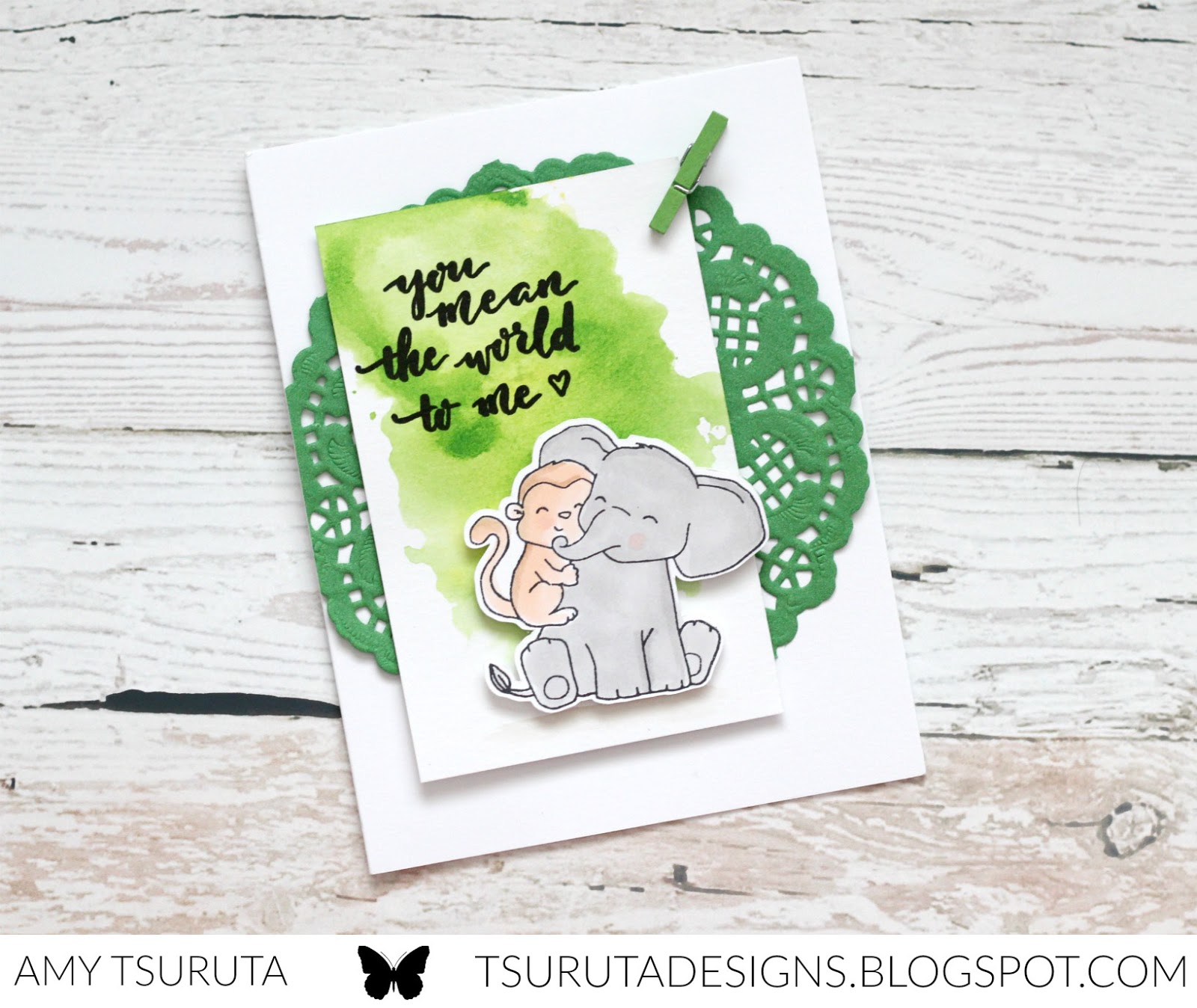 Eep! The Big Hugs with Evelin T Designs is ADORABLE! I couldn’t wait to ink this set up! How cute is that ellie and monkey? I did a bit of a watercolor background and then used the You Mean the World To Me Sentiment in black. I finished it off with a green doily and coordinating clothespin.
