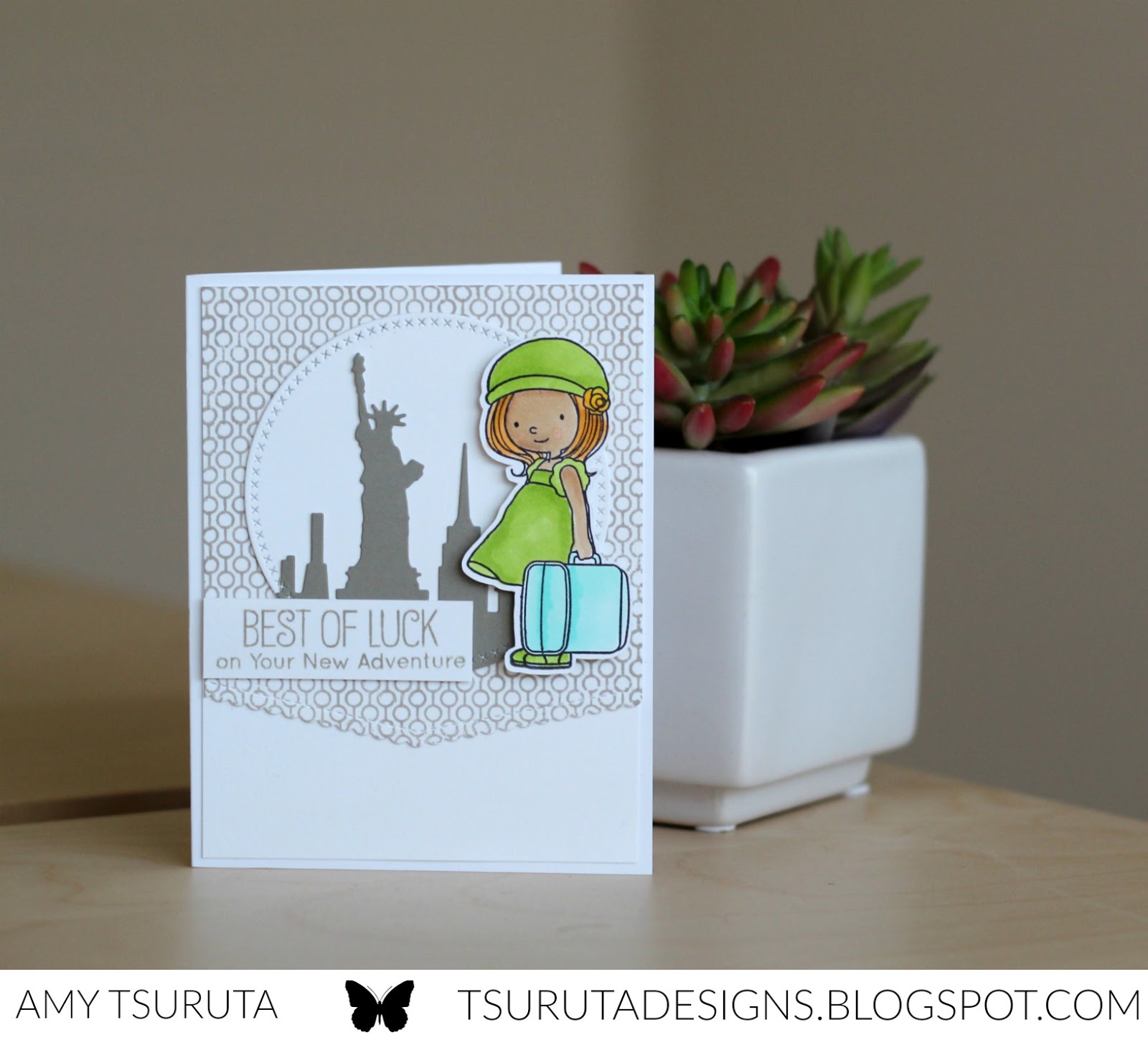 What a fun card for the girl as she travels to NYC – and how wonderful that you both will go to Paris to visit the boy!! Love your card design Amy!