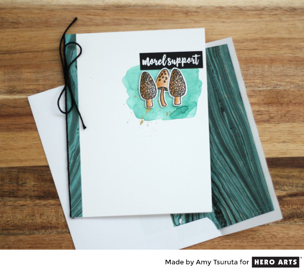 Let’s start with the Marble sheet, I lined my envelope with it. My intention is to hand deliver this card so that the recipient can easily reuse the envelope. I tied the envelope to the card by adding a strip of the same gorgeous paper to my card. The watercoloring was done using my Kuretake Gansai Tambi set. I stamped the morels and colored them with Zig Clean Color markers. The sentiment has been inked with Versamark and heat embossed in White on black cardstock.