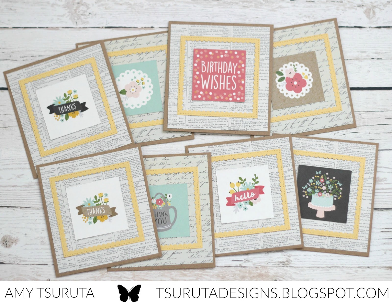 Everything else I used on my card set is from my stash but the overall design was inspired by the shop! I used an older Studio Calico paper pad for the text panels, the Stampin’ Up So Saffron was cut with a Pretty Pink Posh Scallop Squares die and the cardbases are by American Crafts that I trimmed down to 4.25 x 4.0 inches.