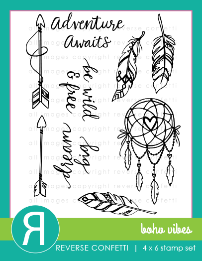 The base is a Midnight panel. I cut a sheet from the Free Spirit paper pad and then layered a Ragged confetti cuts in Lime Green. The adventure is from the Wild Words confetti cuts set. The awaits + feathers are from the Boho Vibes stamps and coordinating confetti cuts.