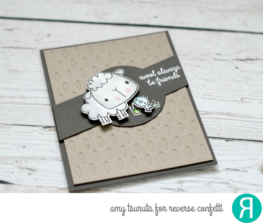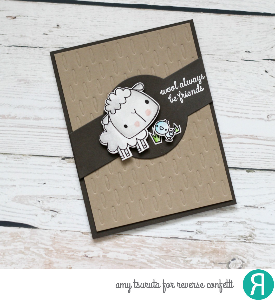 I used Avocado and Lime Green Cardstock with the Big Chevies Cover Panel. The All About Ewe stamped images have been colored with Zig Clean Color Markers. The sentiment has been heat embossed in white on Midnight cardstock.