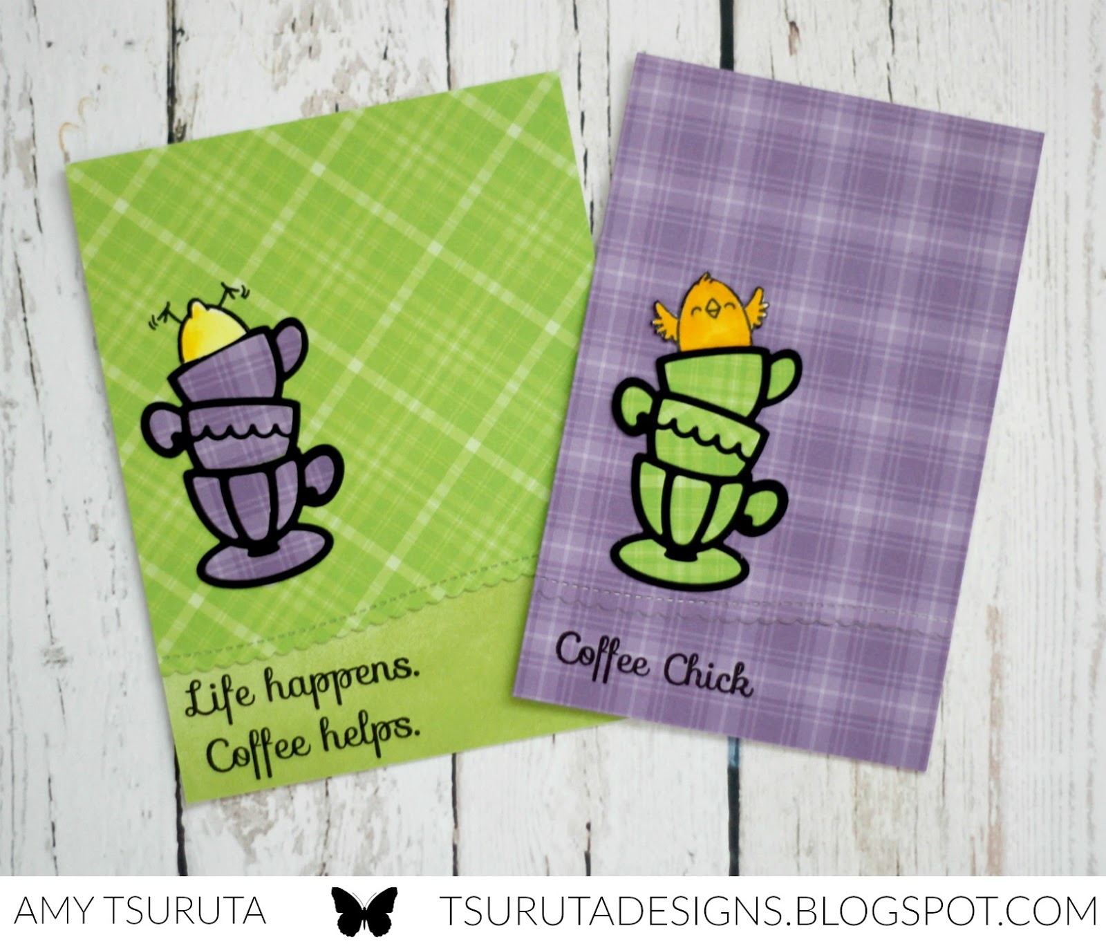 My green based card was inspired by YNS owner/designer Karen. It is a standard A2 card using Lawn Fawn Rainbow Plaid and Watercolor Wishes. They’ve been teamed up with the YNS Coffee and Tea Cup Stacked die set. The chick was colored with Zig Clean Color Markers. The purple based one is a skinny at 3.5 inches x 5.5 inches. The Coffee Chick was colored with copics.