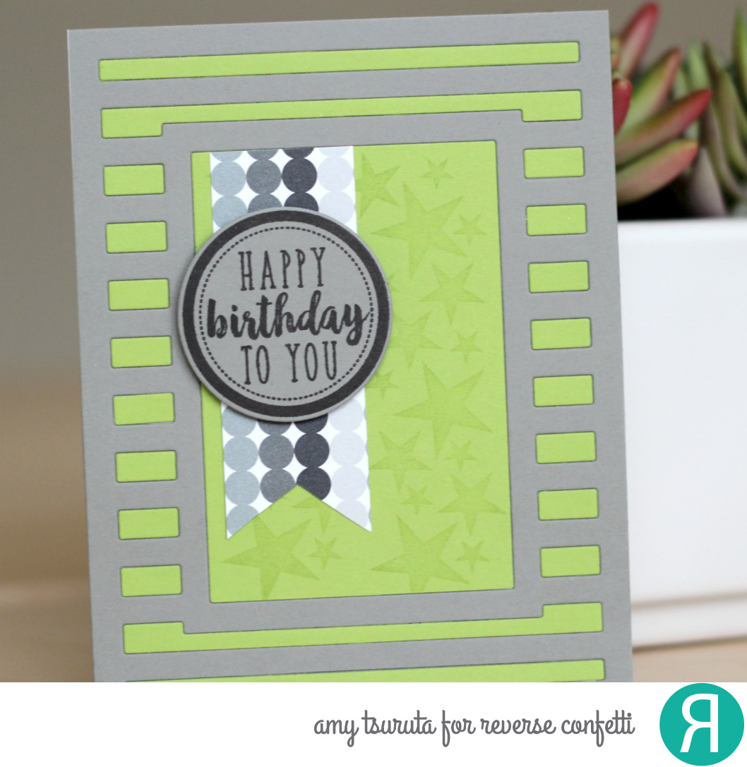 I love the combo of Stormy and Lime Green. The Striped Frame Cover Panel is so much fun! Do you spy So Many Stars? I used Versamark on the stars. The banner has been cut from the Free Spirit 6×6 Paper Pad. The Circle Wishes Stamp Set and Coordinating Confetti Cuts was perfect for my card design.