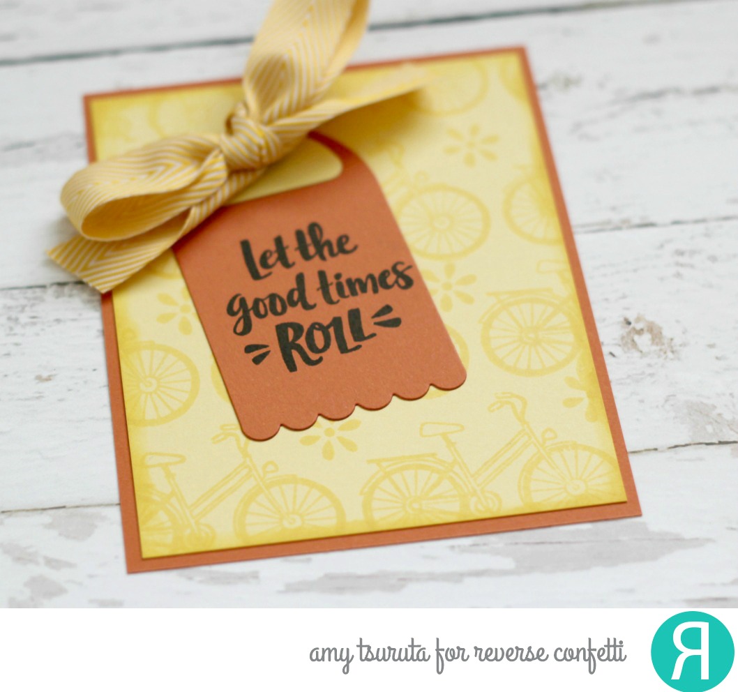 The new Round Top Tag is so much fun…love how you see the peek-a-boo top under the ribbon from my stash. LOVE the fun sentiments in the Rollin’ set!