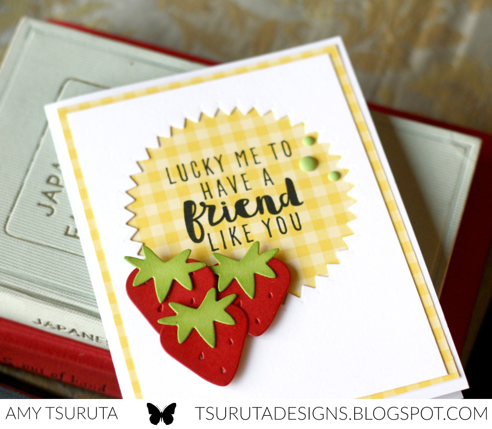 Love those "sweet" strawberries! I might need them… love the combo with the yellow gingham and that awesome sentiment…