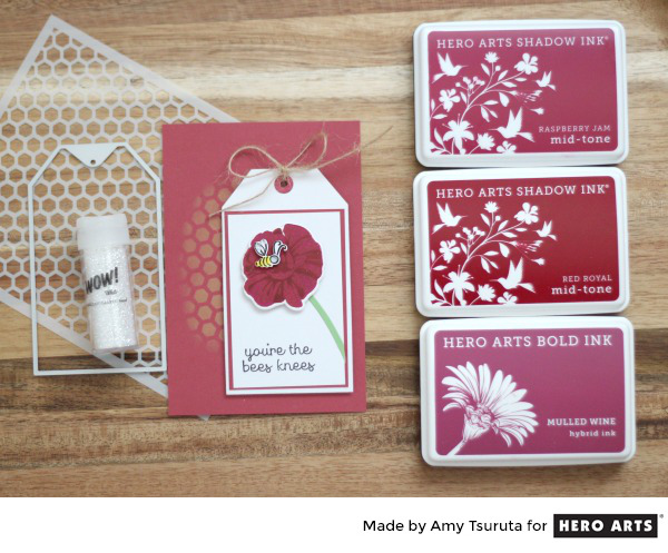 To really let that bee be the star of the show, I surrounded him with reds, making his yellow POP. I inked up the Honeycomb Stencil with Distress Oxide Fossilized Amber. The Color Layering Poppy has been inked up with:
