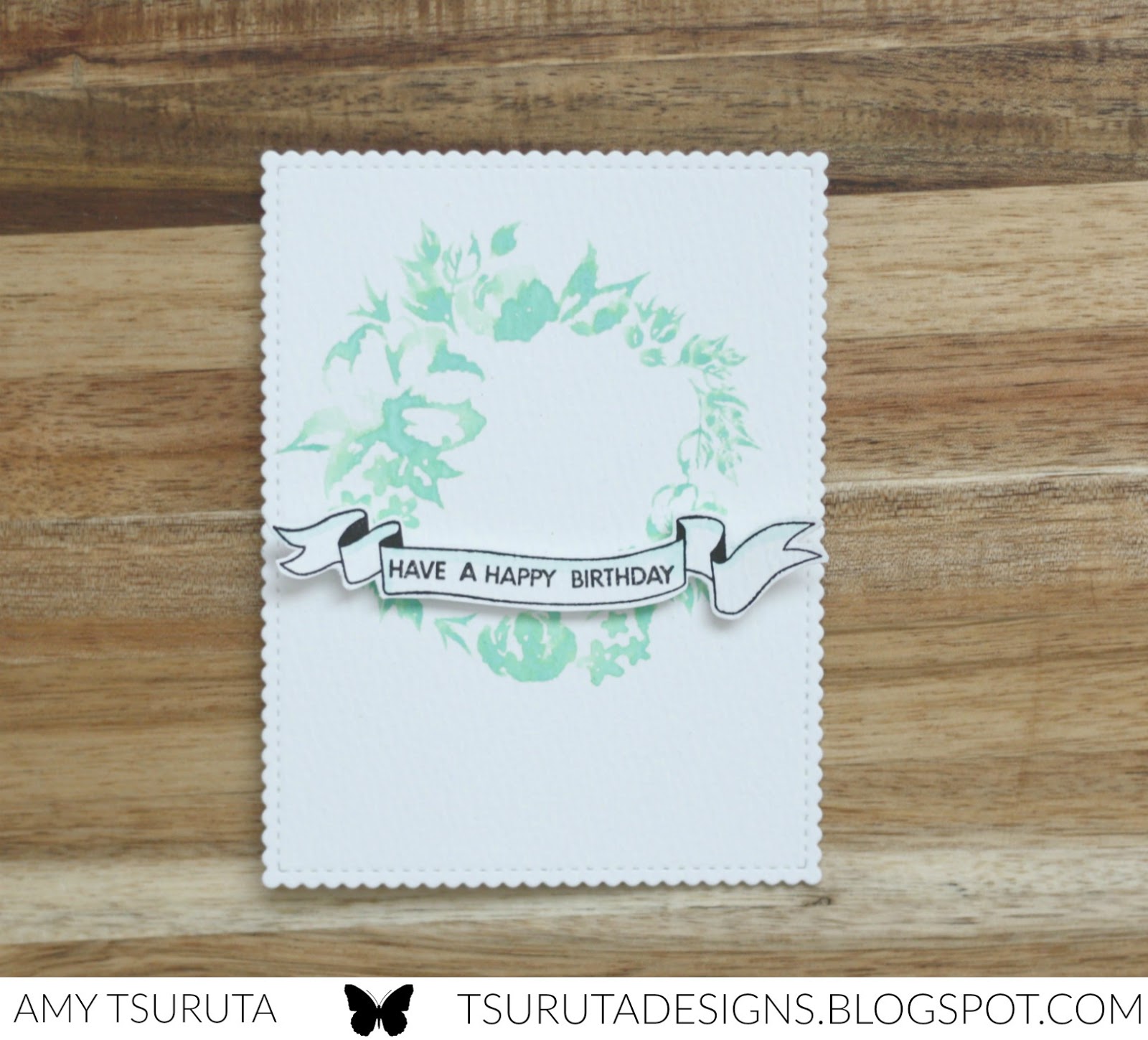 Oh my goodness, I ADORE the Watercolor Wreath! This card was so very quick to make..can you believe it? I popped my watercolor panel in my Mini MISTI and centered the wreath. I inked it up with Distress Oxide in Cracked Pistachio. Before I stamped it on my watercolor panel I spritzed it with water…that’s it. This image is perfect for this technique because it gives it a layered look, don’t you agree?
