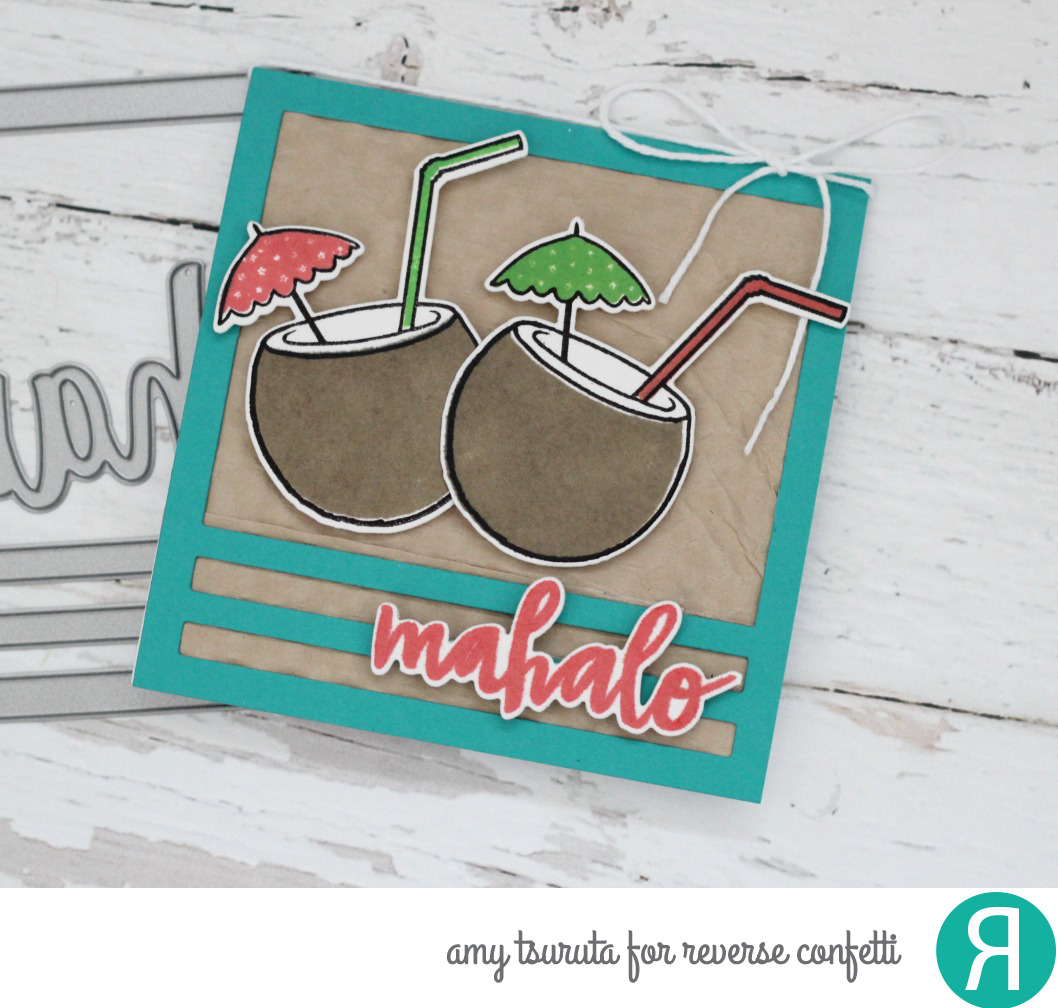 Next up is a card that features the new Mahalo stamps + coordinating confetti cuts. I also teamed it up with an altered Thanks Square confetti cuts: