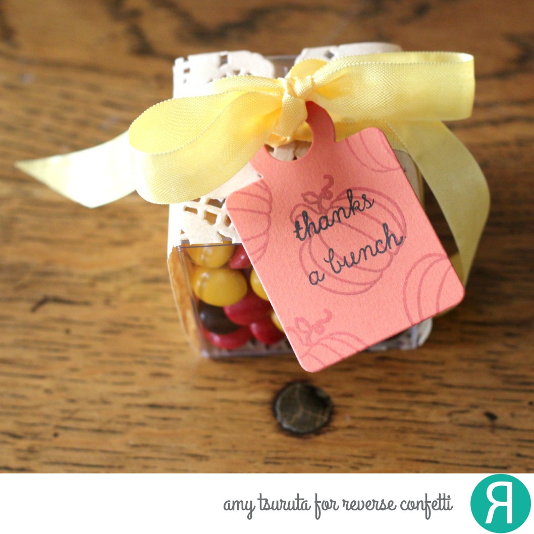 The Mini Clear Box is such a fun giftie container. You could fill it with so many different things, including Macarons! I used one of the tag’s from Tag Duo and stamped the same pumpkin in Rust on Rust cardstock. The sentiment is from the same, Nuts About You set. Can you tell what I used as a wrap for my box? It’s 2 trimmed down kraft colored doilies.