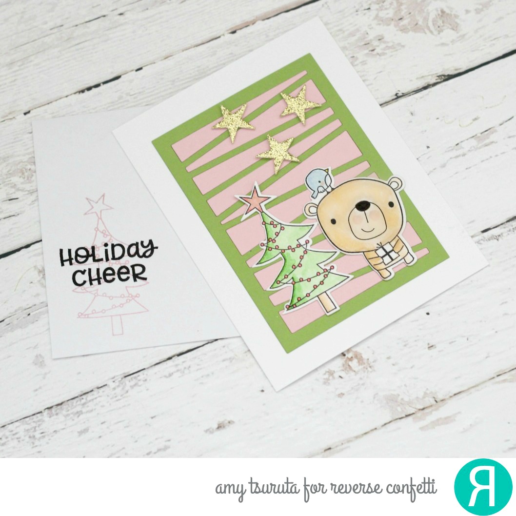 I cut the Wonky Stripe Panel in Lime Green + Piggy Bank cardstock. Check out those fun stars, the Christmas Bear set has a star in the confetti cuts set…isn’t the bear and her friend the bird adorable?! I decided to not disrupt my scenery so I stamped my sentiment on the envelope in Midnight ink. The tree is in Piggy Bank.