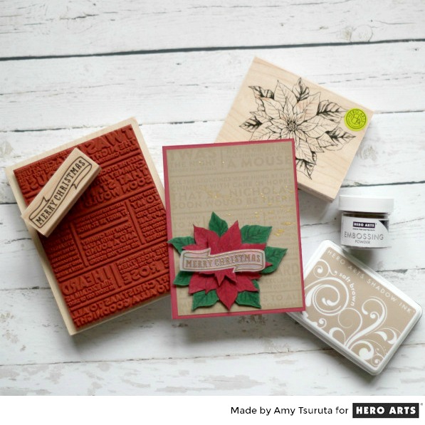 Beautiful Christmas card, Amy! LOVE the poinsettia and the poster background stamps.
