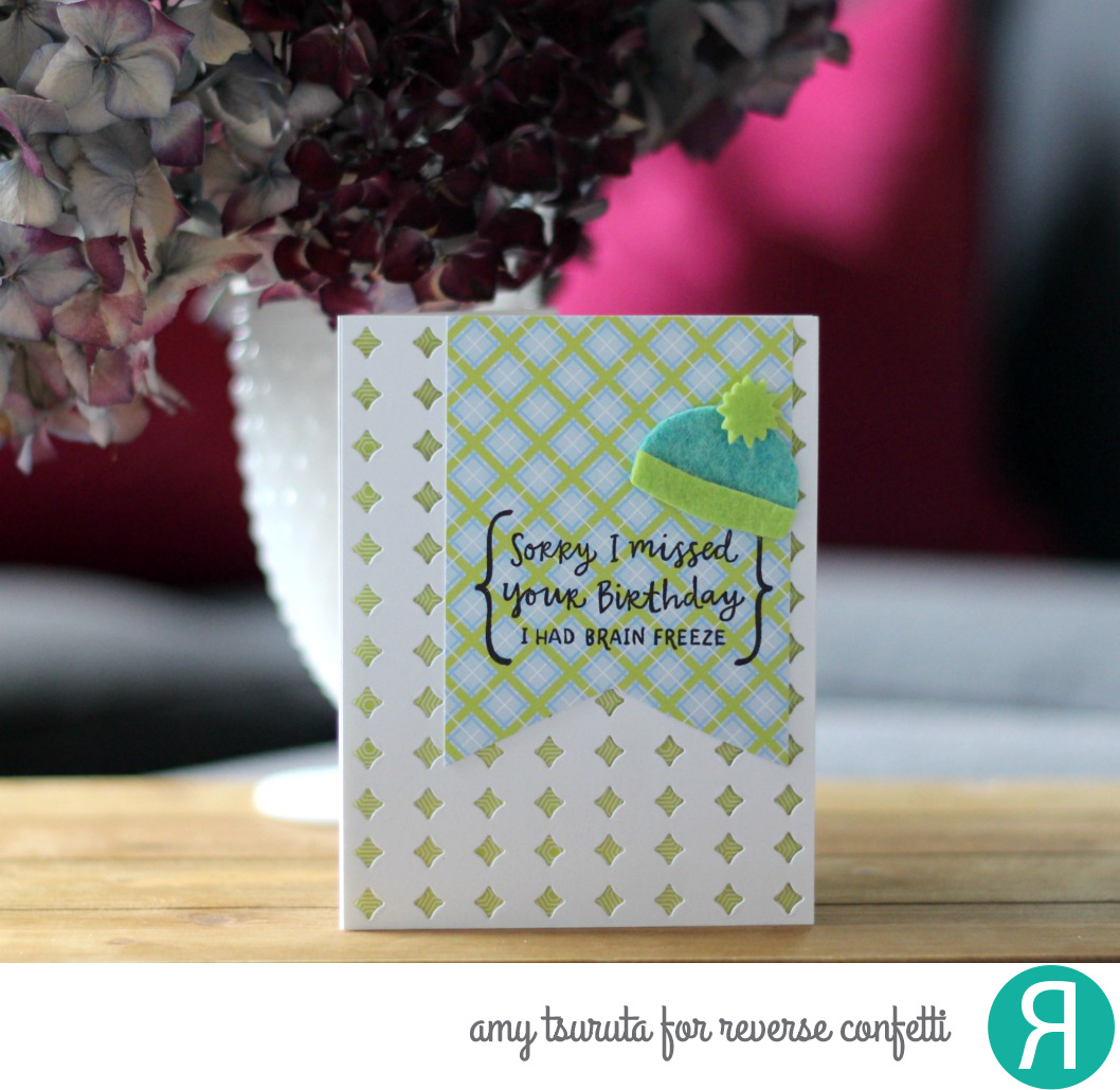Both of your cards are perfect! The kitchen card looks so sweet colored to match the background paper! Also, I love the Small Diamond Cover Panel. It was so clever to use the hat as something to go along with brain freeze!