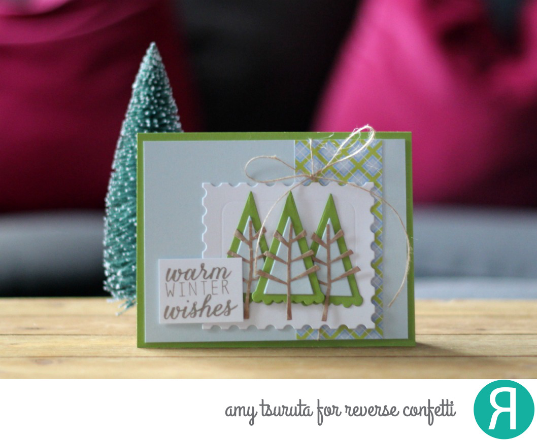 Love this card, Amy! Love the trees, love the plaid and postage stamp, and love these colors!