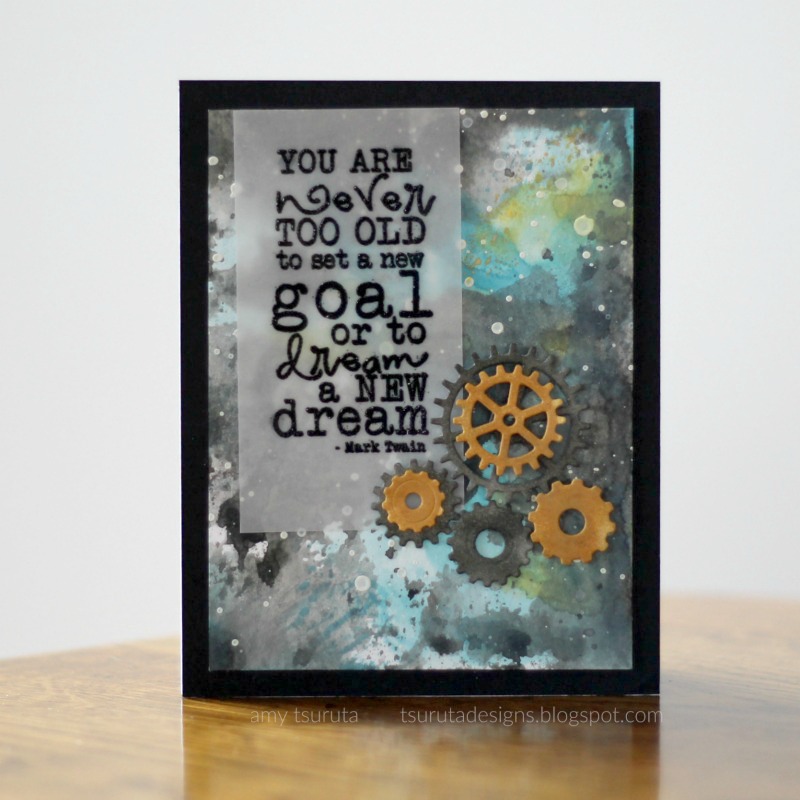 I’m a big fan of the ink smooshing technique. The background is a combo of Distress Oxides in Black Soot, Peacock Feathers + Fossilized Amber.