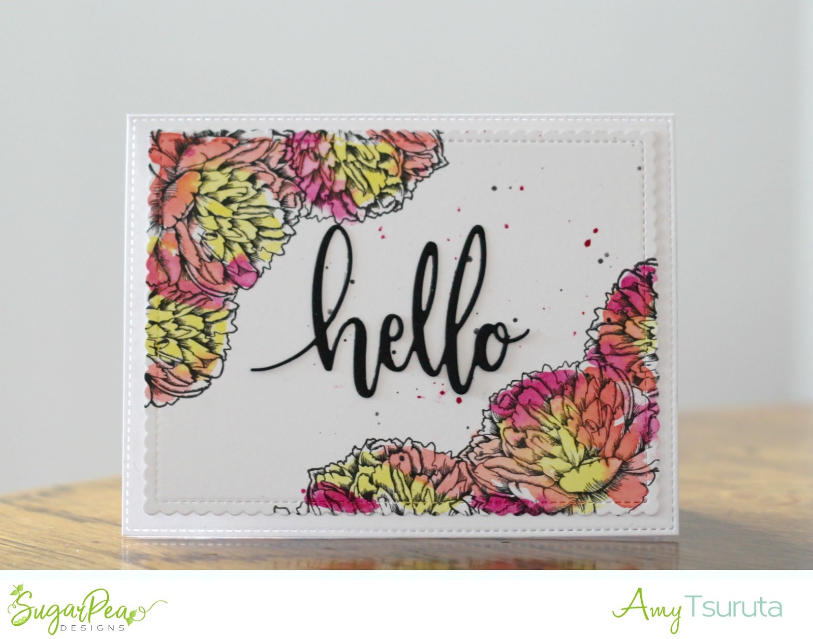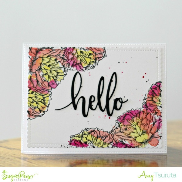 Using my Peerless Watercolors, I quickly colored in the blooms using 3 different colors. The Hello has been cut from black cardstock and I finished off the panel with watercolor splatters.