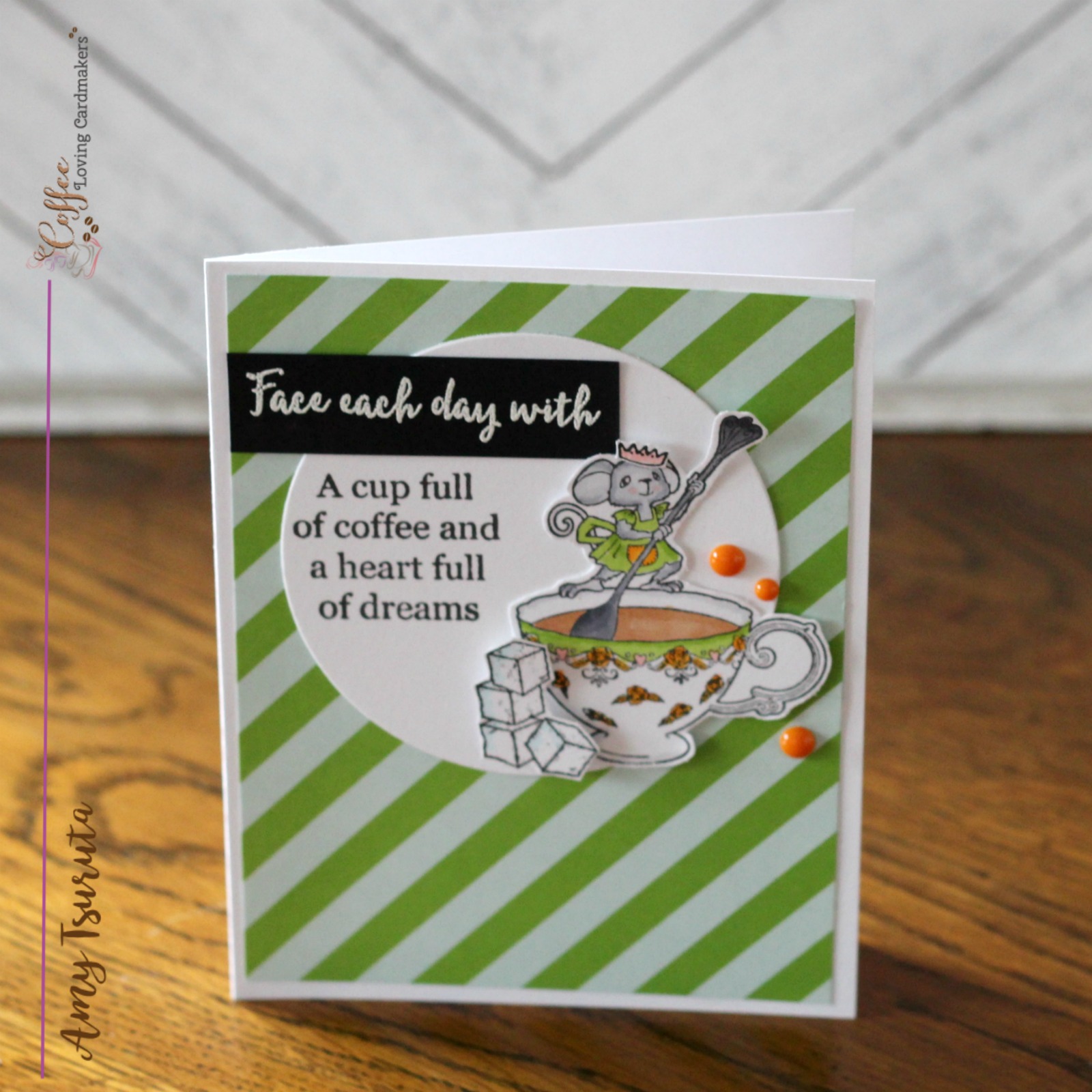 This really is such a cute set, and I LOVE what you've done with it, Amy! Gorgeous coloring on that sweet mouse and I adore her fancy tea cup. She is precious with the crown, and I really like how you added the sugar cubes on the side, too. Fabulous sentiment, and fabulous green stripes. Seriously love every little bit of this!