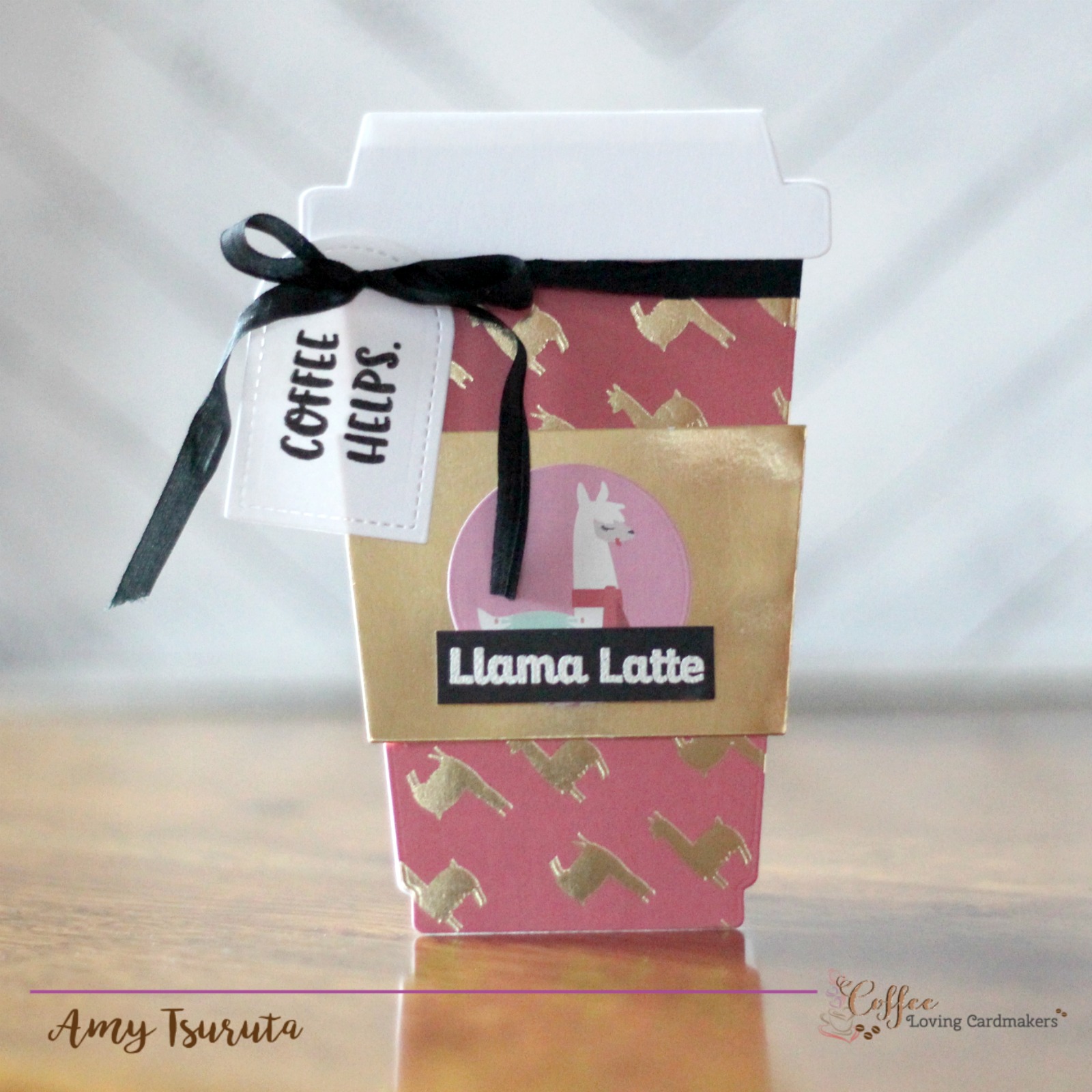 Llama Latte is a sentiment that I discovered through crafty friend Deb Davison. She had posted something on FB and I loved it. Joanne not only sells hilarious stamps, she does custom orders so I designed the llama latte one. The pink/gold llama paper and llama in the center are from the Craft Smith Falalallama pad (my crafty friends are awesome and I received a couple of the paper pads!).